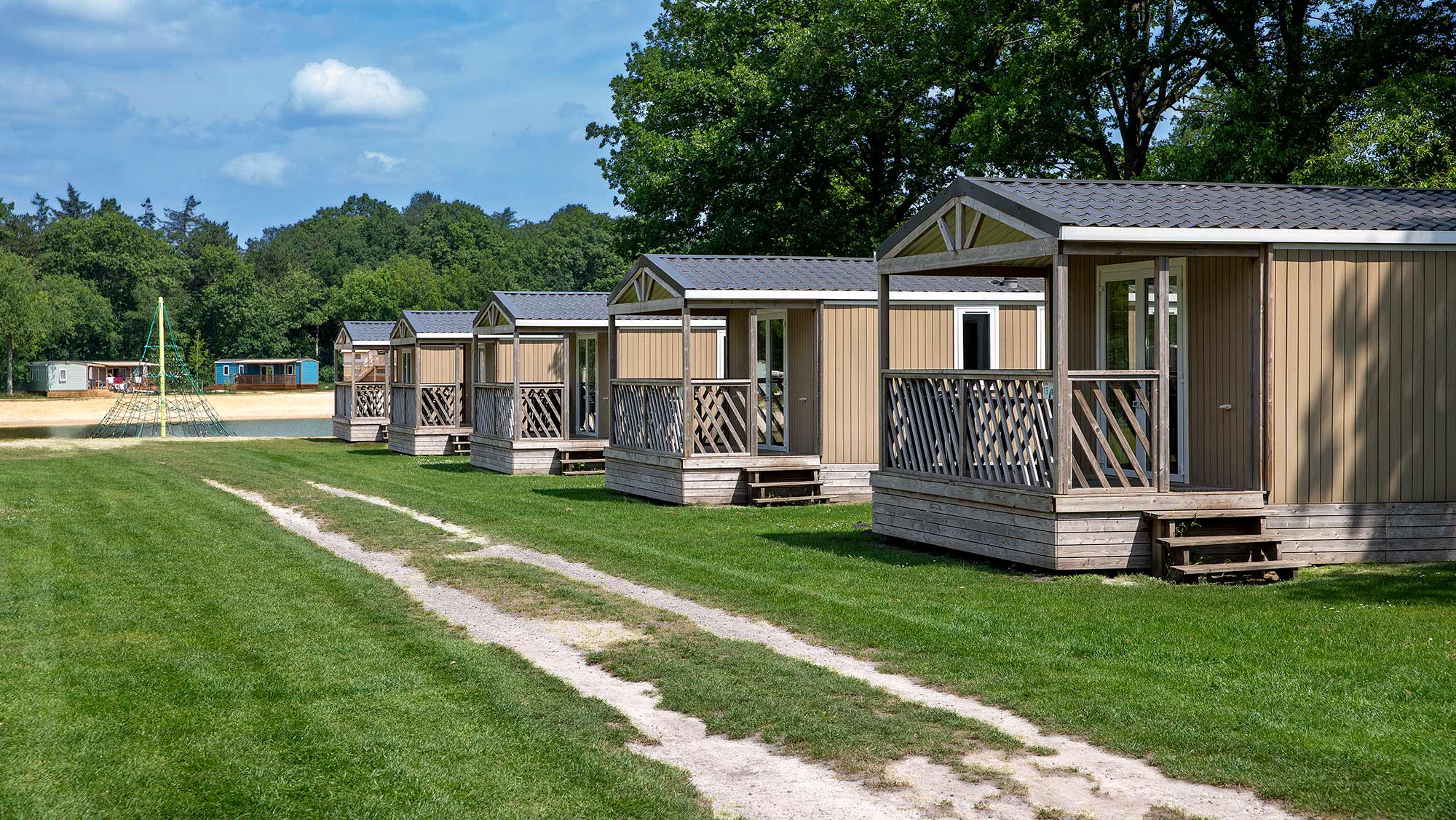 De foto is gemaakt na plaatsing van chalet Krekel. De onderkant van het chalet wordt afgewerkt met hout.